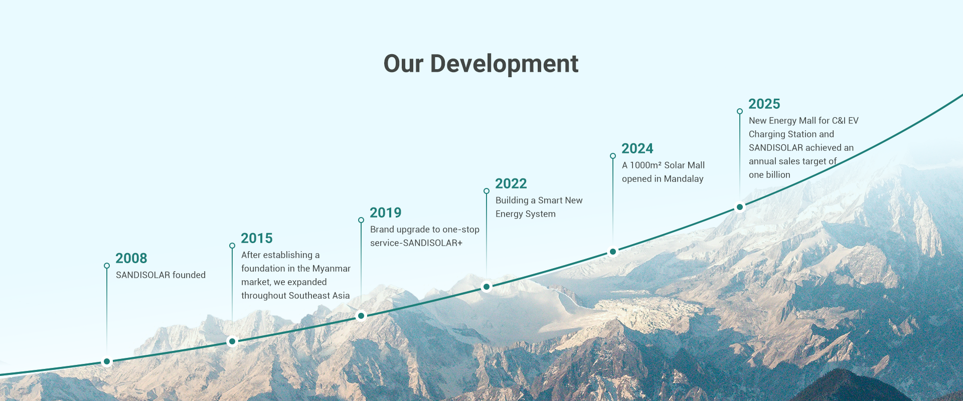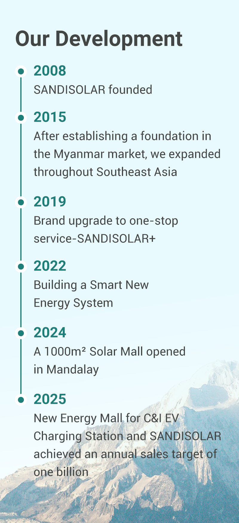SANDISOLAR è stata fondata in 2008 ed è un'azienda high-tech nella ricerca, sviluppo, produzione, e la vendita di prodotti come moduli fotovoltaici, Inverter, Batterie, energia, Sistemi di archiviazione, Ricarica EV, e nuove applicazioni energetiche. Sfruttare prodotti leader nel settore e un sistema intelligente di gestione dell'energia, la nostra azienda ha penetrato i nuovi mercati energetici in Myanmar e Thailandia, offrendo innumerevoli case e industrie & Imprese commerciali: una soluzione energetica integrata e completa che copre l'intero "ricarica-accumulo solare-ricarica" Spectrum—portare davvero energia pulita a migliaia di fabbriche.